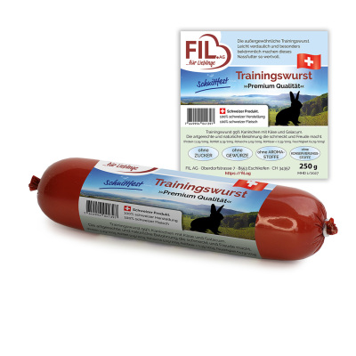 Trainingswurst 99% Geflügel aus Schweizer Tierhaltung mit Galacum und Käse. Eine aussergewöhnliche Trainingswurst, leicht verdaulich und bekömmlich. Ein Leckerbissen für jeden Liebling. Hergestellt in der Schweiz mit Schweizer Rohstoffen.